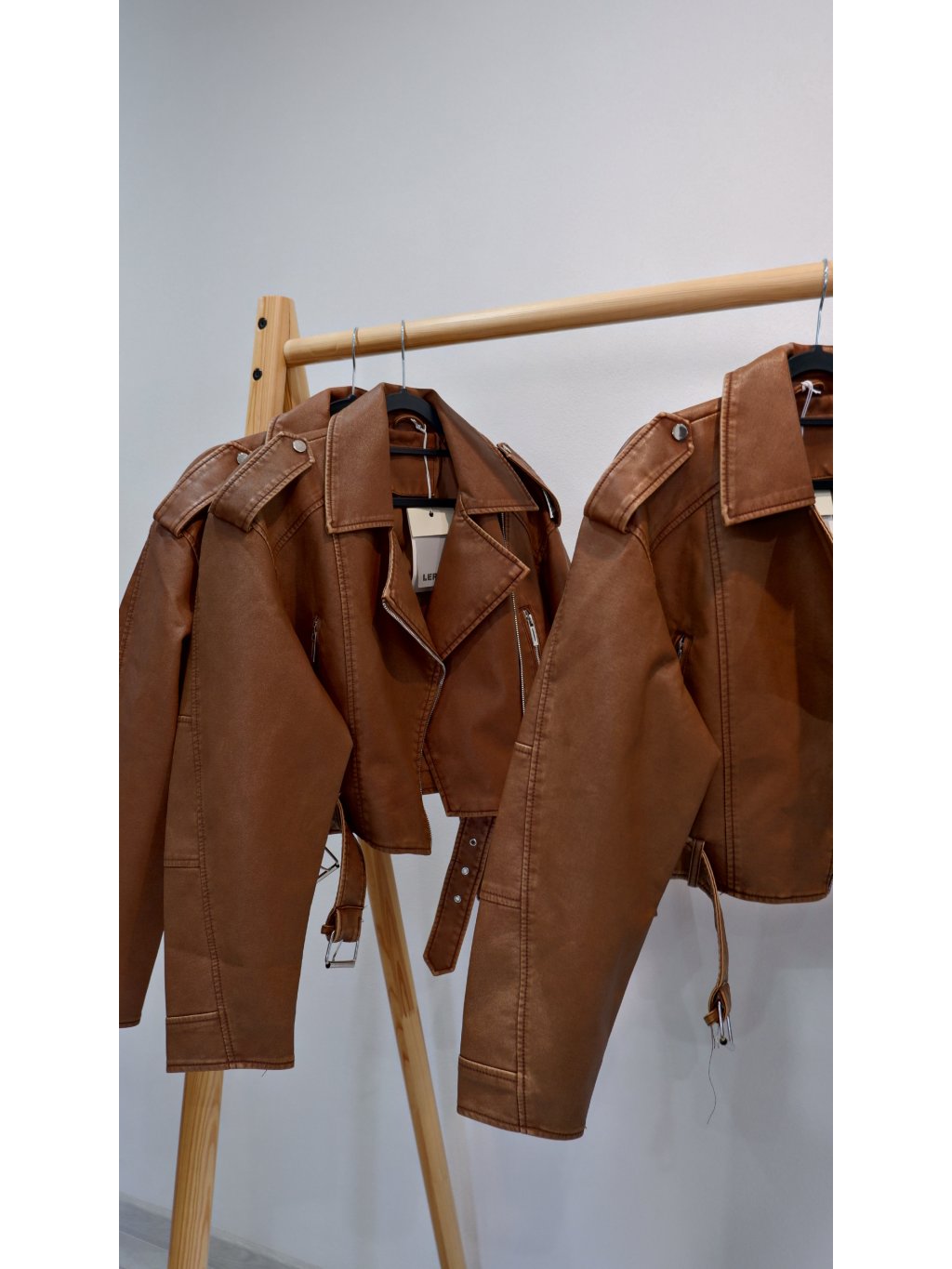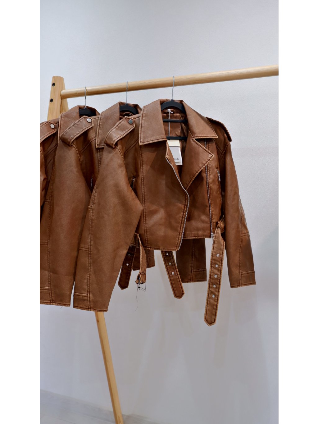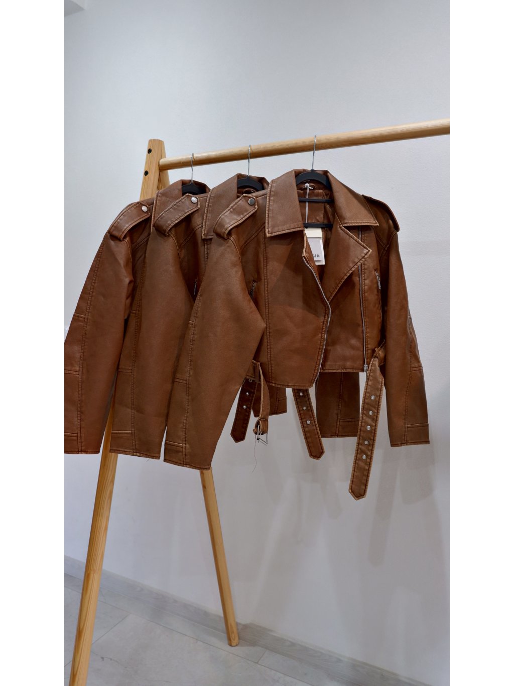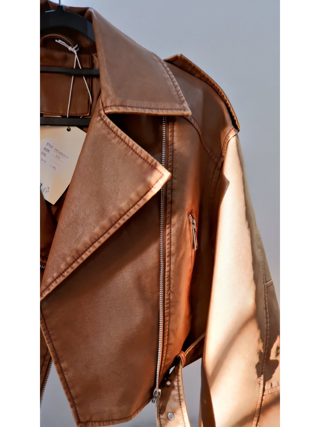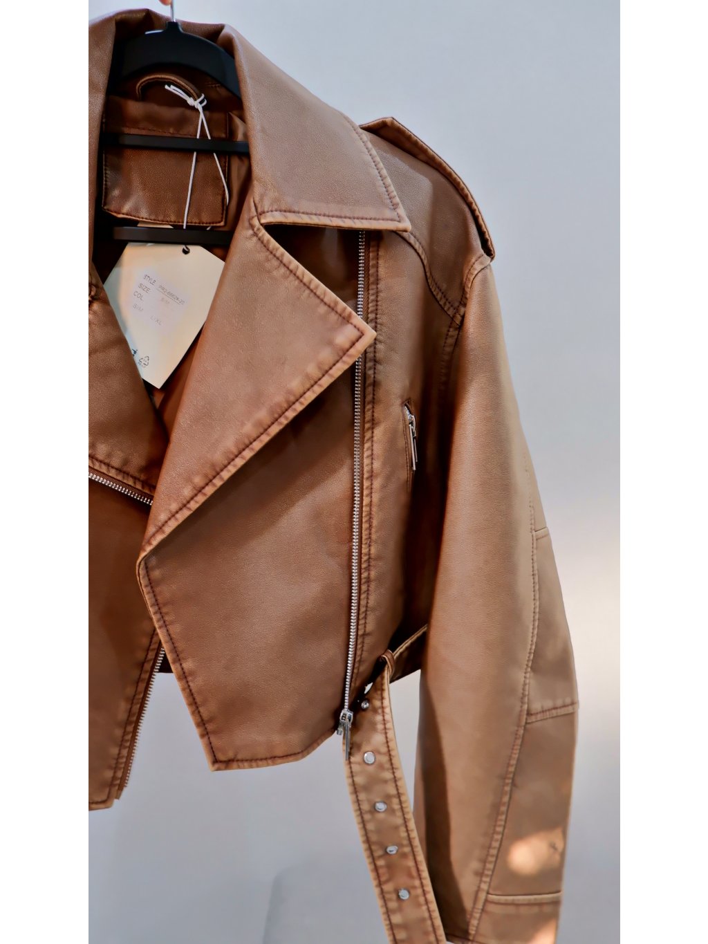 Koženka, kvalitne prepracovana v zaujimavom strihu doplnena prackou. Je podsita. Rukavy maju moerne puff efekt a ku koncu sa zužujú.