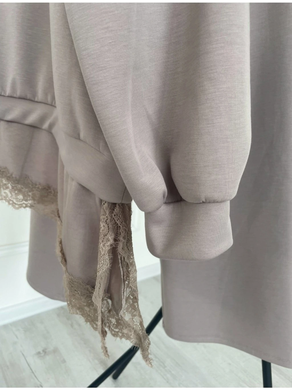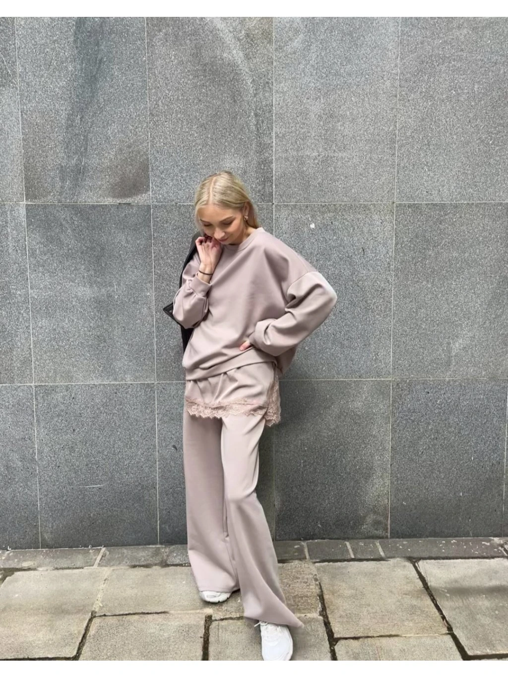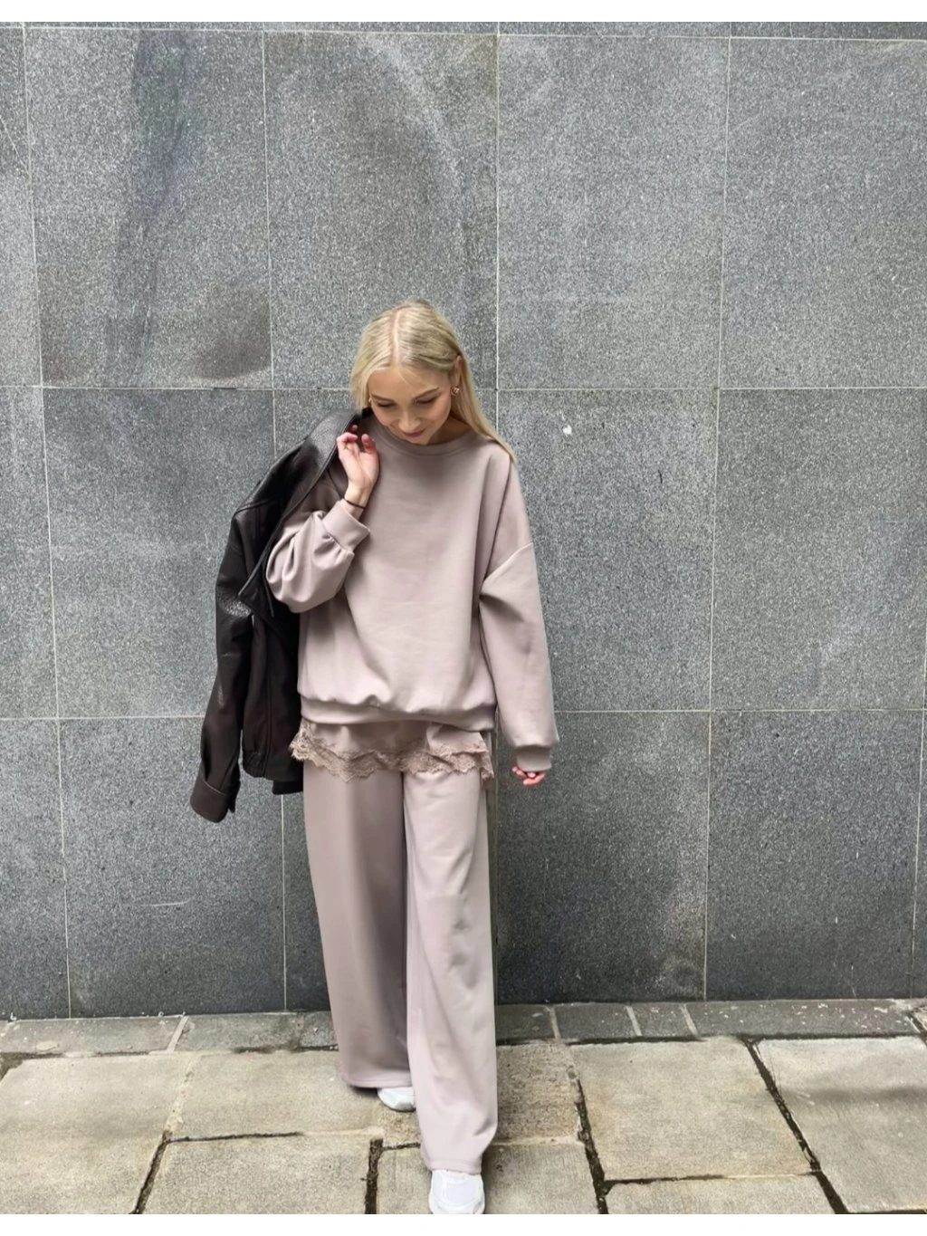 Komplet pozostavajuci z oversize mikiny s cipkou a volnymi nohavicami v pase s gumickou bez zapinania.