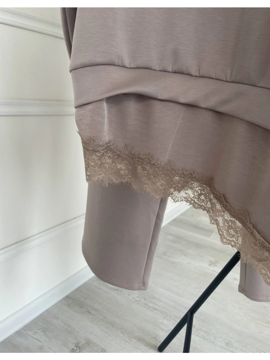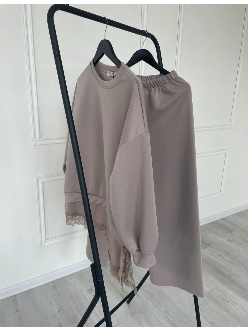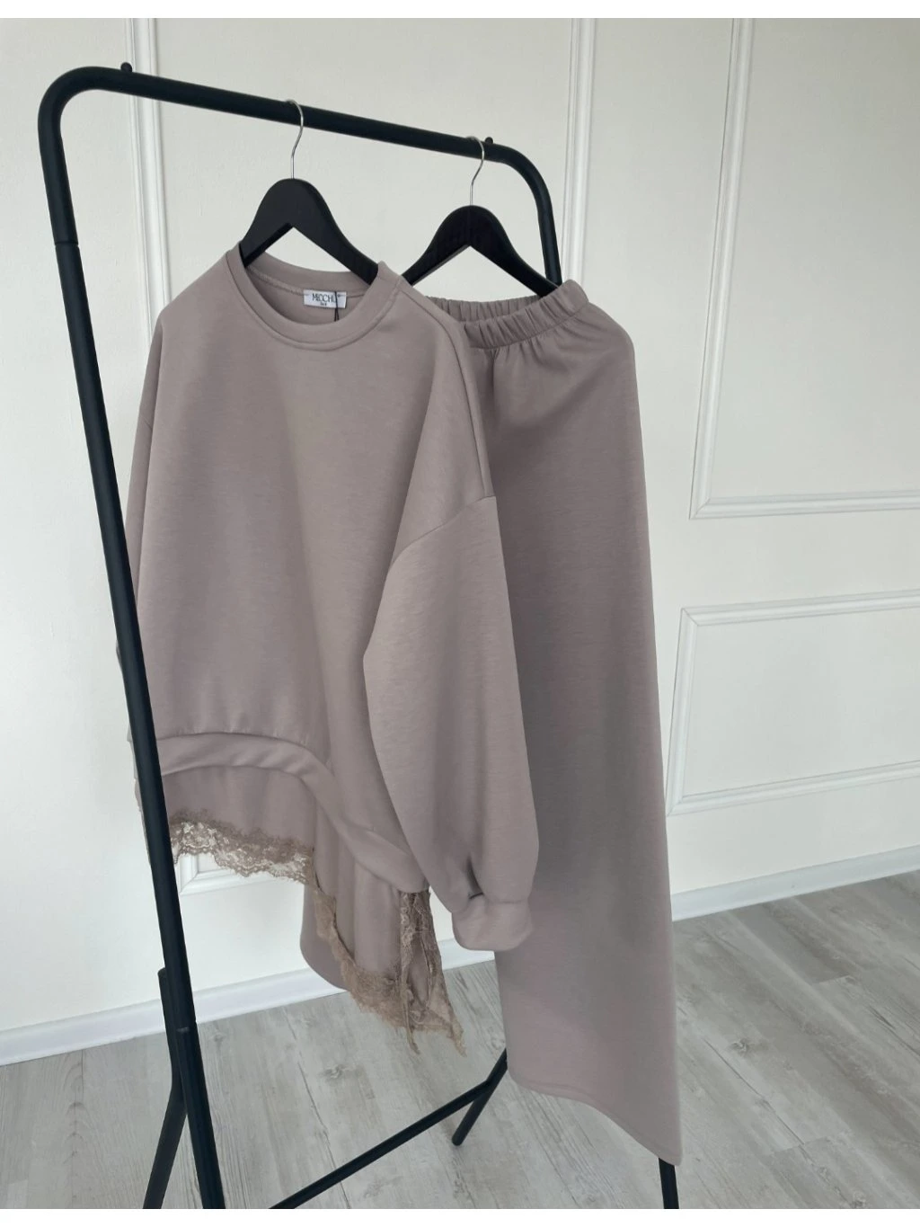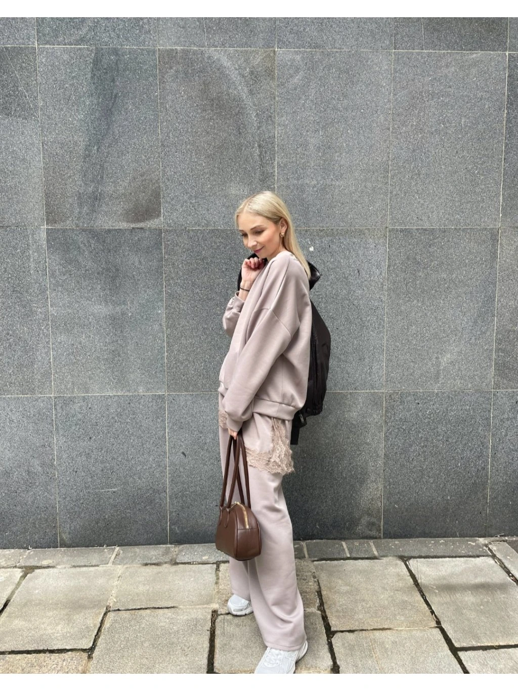 Komplet pozostavajuci z oversize mikiny s cipkou a volnymi nohavicami v pase s gumickou bez zapinania.