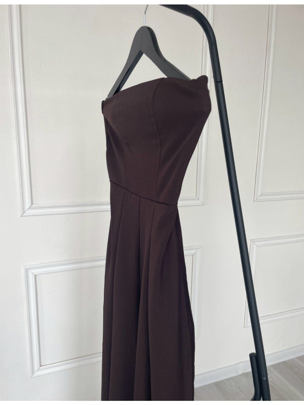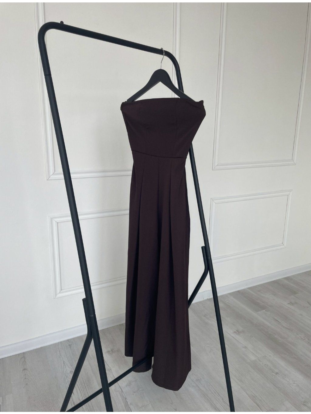 Čokoladovy overal so sirokymi nohavicami, ktore maju vpredu sity sklad z elegantneho materialu. Ma vrecka. Vzadu pod prsiami a hore ma skrytu gumicku pre prisposobenie. Predok na prsiach je vystuzeny a ma vypln na poprsi. Zapinanie na bocnej strane na zips