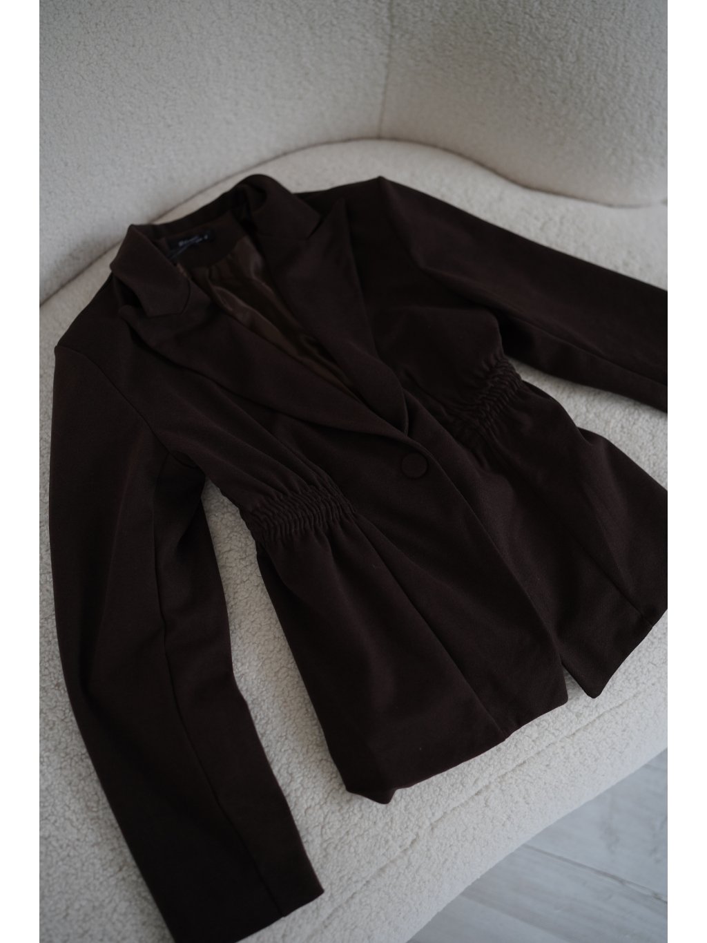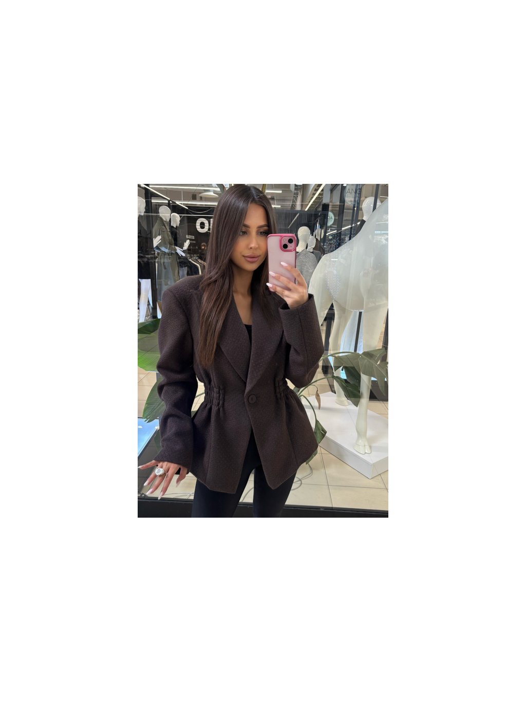 Semišové sako bez vzoru (na foto je ukazka toho iste saka ale so vzorom), ktoré ma po bokoch sťahovacie patenty. Zapinanie na gombik. Ma vypln na ramenach a v hornej casti limec. Sako je v Uni velkosti a sedí na XS/S/M.